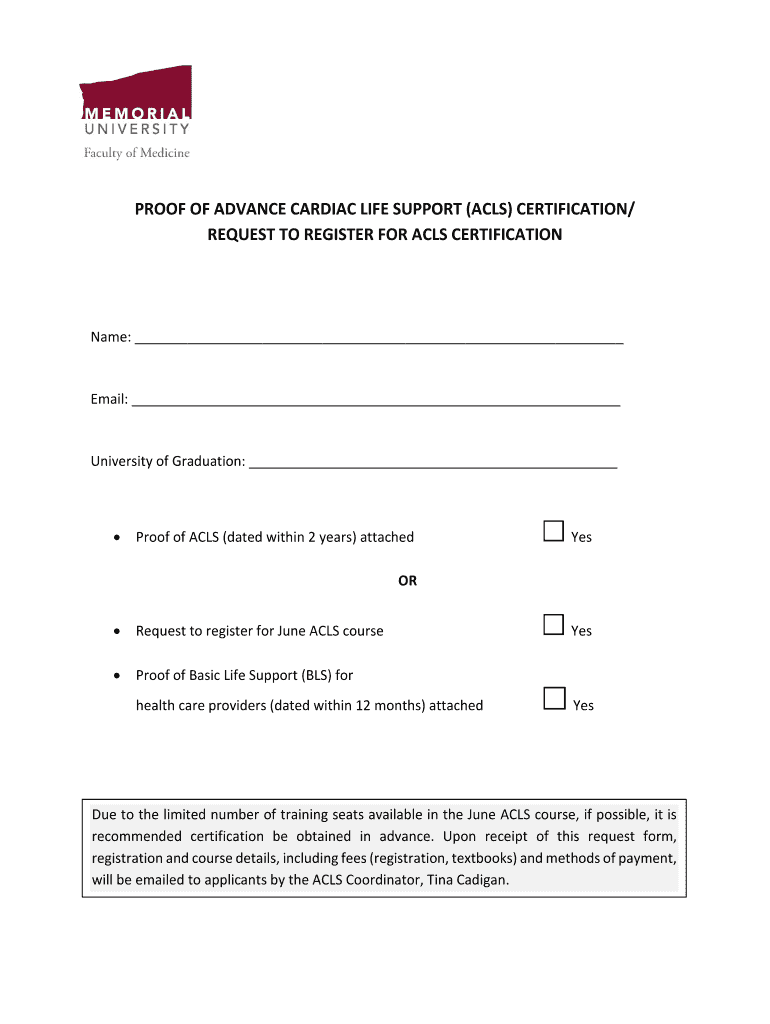 PROOF OF ADVANCE CARDIAC LIFE SUPPORT (ACLs) CERTIFICATION/ REQUEST TO REGISTER FOR ACLs CERTIFICATIONName: Email: University of Graduation: Proof of ACLs (dated within 2 years) attachedYesOR Request