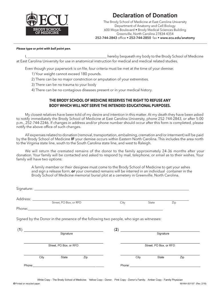 Declaration of Donation Brody School of Medicine at East Carolina University Department of Anatomy and Cell Biology 600 More Boulevard Brody Medical Sciences Building Greenville, North Carolina 278344354