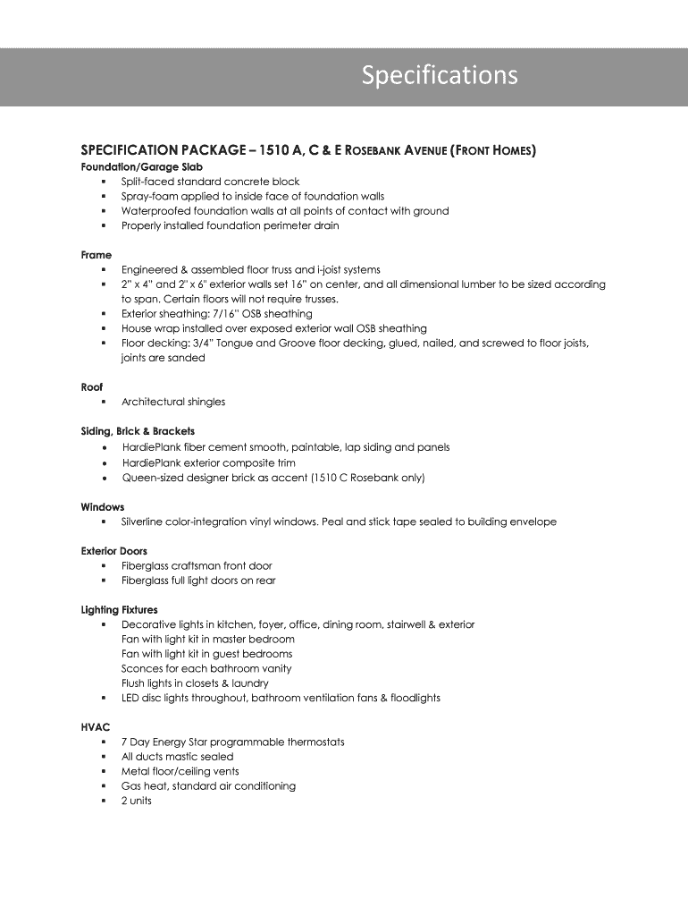 Specifications SPECIFICATION PACKAGE 1510 A, C & E ROSEANN AVENUE (FRONT HOMES) Foundation/Garage Slab Split faced standard concrete block Spray foam applied to inside face of foundation walls Waterproofed