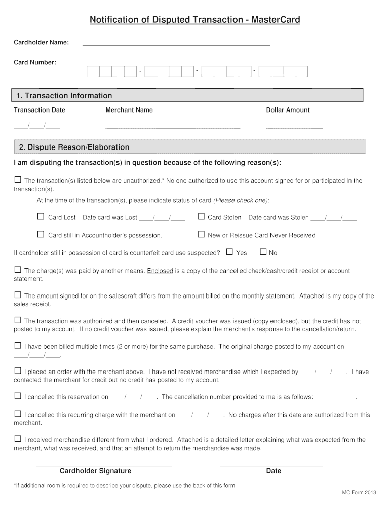 Notification of Disputed Transaction MasterCard Cardholder Name: Card Number: 1.1. Transaction Information: Transaction Information Transaction DateMerchant NameDollar Amount / / 2.2. Dispute Reason/Elaboration: