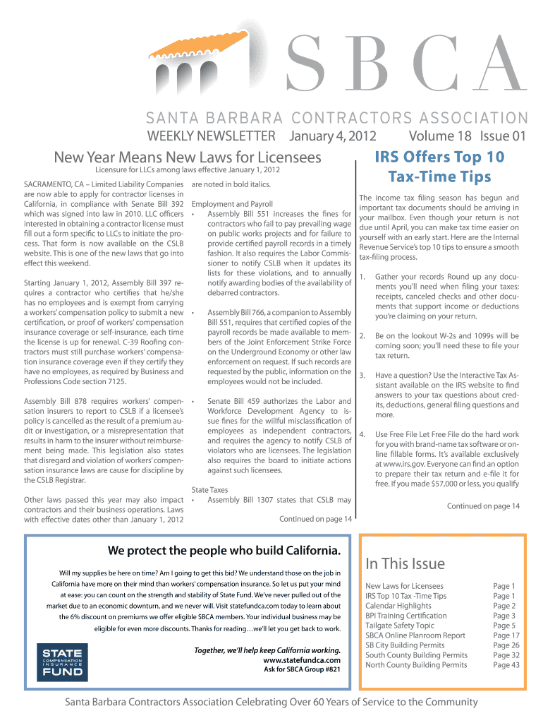 WEEKLY NEWSLETTER January 4, 2012IRS Offers Top 10 Daytime Tipster Year Means New Laws for Licensees Licensure for LCS among laws effective January 1, 2012SACRAMENTO, CA Limited Liability Companies