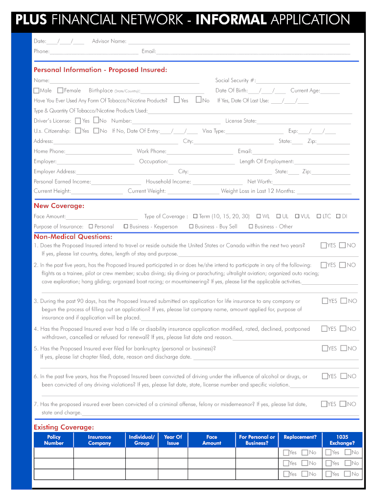 PLUS FINANCIAL NETWORK INFORMAL APPLICATION Date: / / Advisor Name: Phone: Email: Personal Information Proposed Insured: Name: Male FemaleBirthplaceSocial Security #: (State/Country): Have You Ever