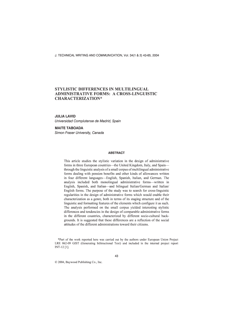 J. TECHNICAL WRITING AND COMMUNICATION, Vol. 34(1 & 2) 4365, 2004STYLISTIC DIFFERENCES IN MULTILINGUAL ADMINISTRATIVE FORMS: A CROSSLINGUISTIC CHARACTERIZATION×JULIA LAID University Computers de