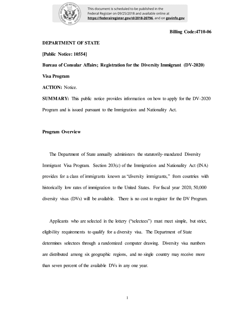 This document is scheduled to be published in the Federal Register on 09/25/2018 and available online at https://federalregister.gov/d/201820796, and on gov info. Billing Code:471006 DEPARTMENT OF