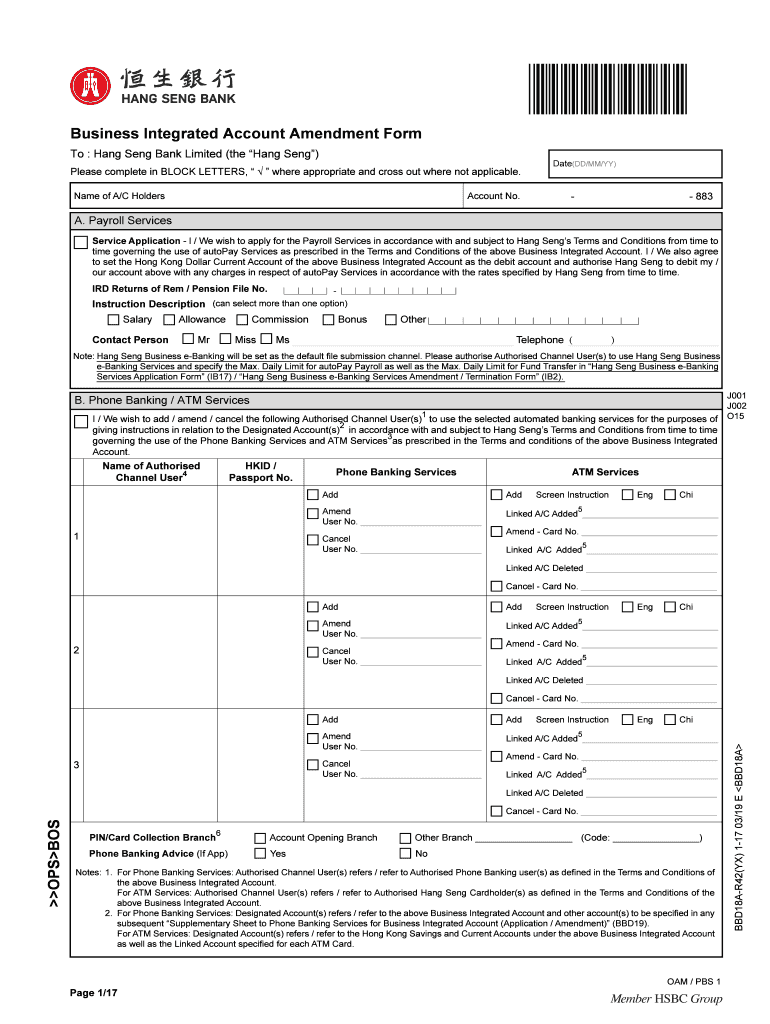 Business Integrated Account Amendment Form To : Hang Seng Bank Limited (the Hang Seng) Please complete in BLOCK LETTERS, where appropriate and cross out where not applicable. Name of A/C HoldersAccount