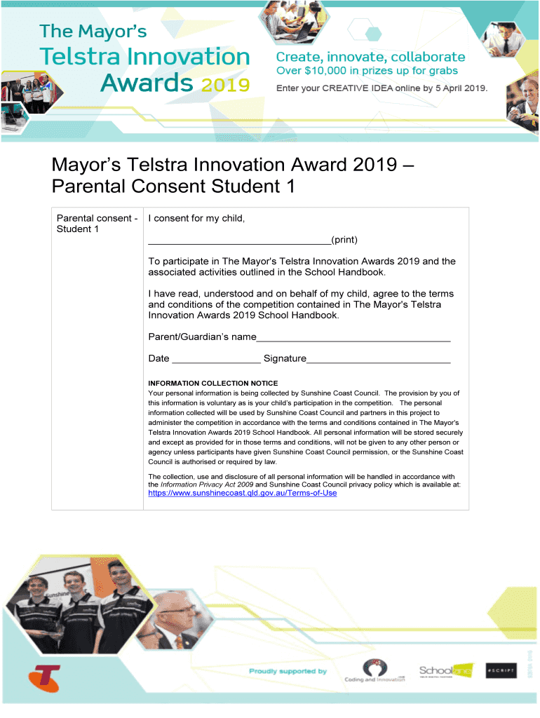 Mayors Telstra Innovation Award 2019 Parental Consent Student 1 Parental consent Student 1I consent for my child, (print) To participate in The Mayor's Telstra Innovation Awards 2019 and the associated