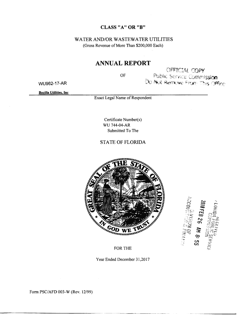 CLASS “A OR “B WATER AND/OR WASTEWATER UTILITIES (Gross Revenue of More Than $200,000 Each)ANNUAL REPORT OF WU96217 AR Bonilla Utilities, Inexact Legal Name of RespondentCertificate Number(s)