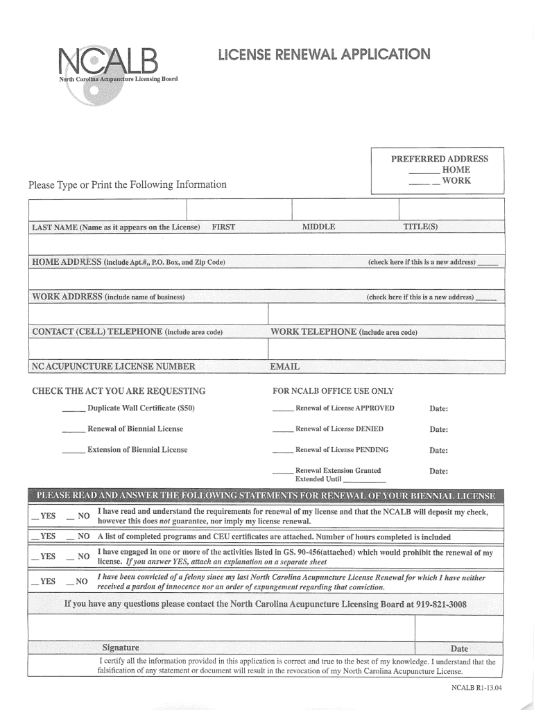 Download the application form from the North Carolina Acupuncture Licensing Board website.