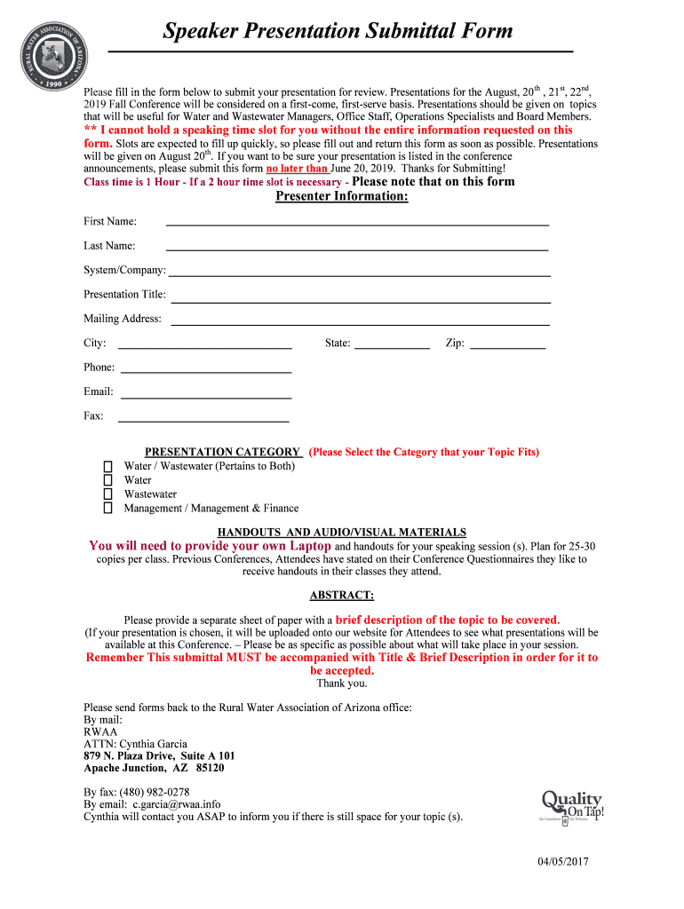 Get the free Speaker Presentation Submittal Form - rwaa.info