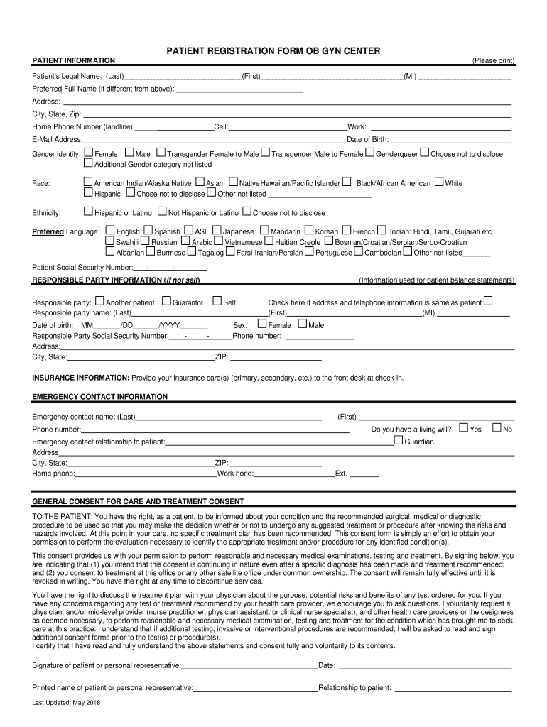 Healthcare providers such as hospitals, clinics, and doctors' offices are required to file patient registration form ob for each new patient.