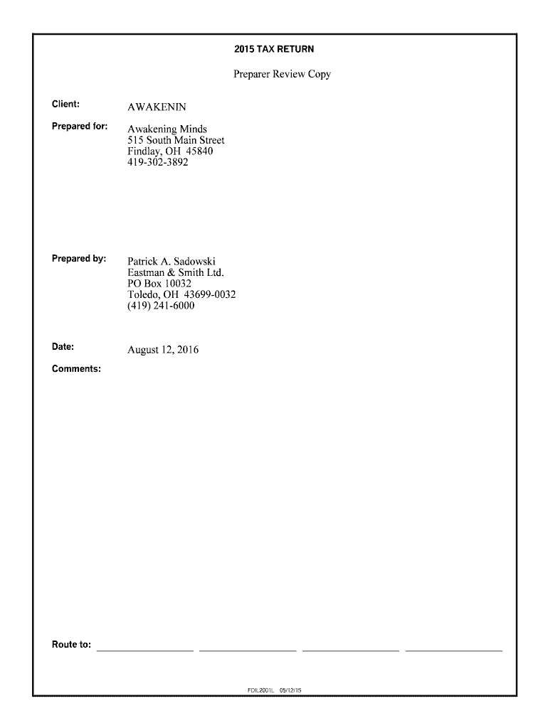 2015 TAX RETURNPreparer Review Copy Client:AWAKENINPrepared for:Awakening Minds 515 South Main Street Findlay, OH 45840 4193023892Prepared by:Patrick A. Wazowski Eastman & Smith Ltd. PO Box 10032
