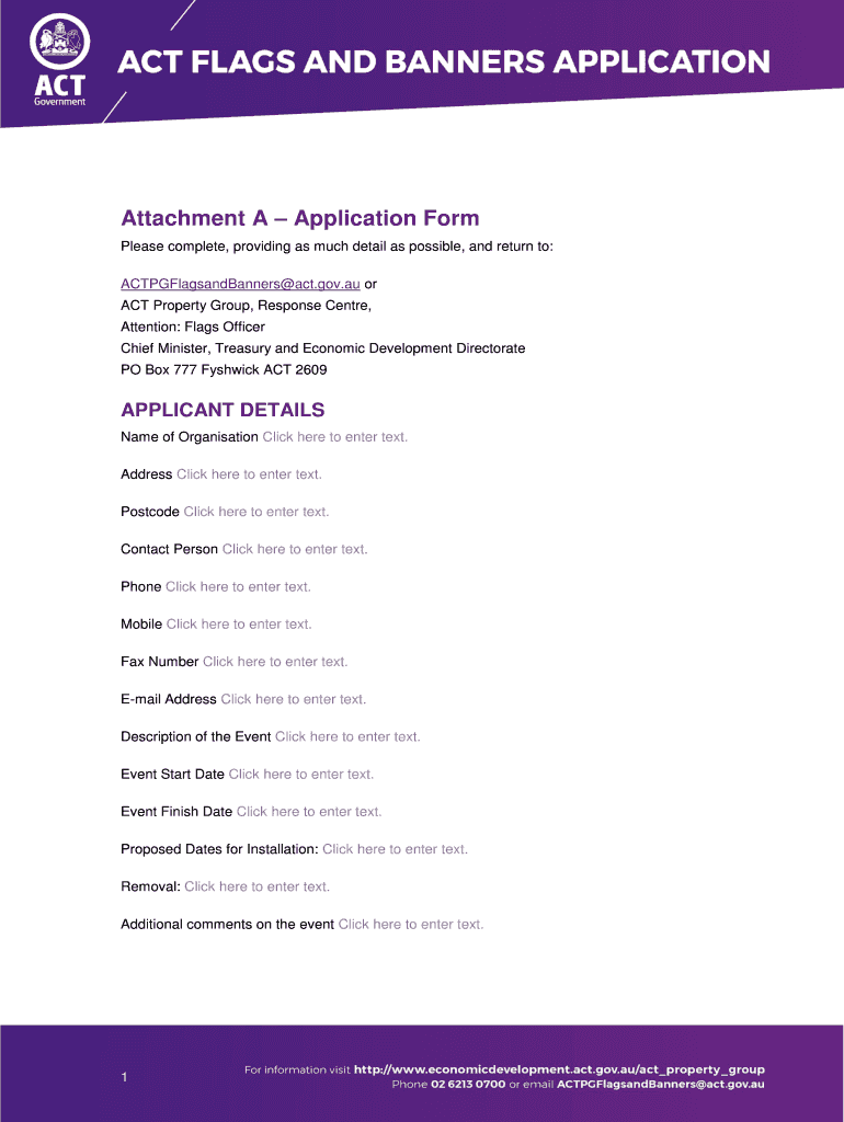 Attachment A Application Form Please complete, providing as much detail as possible, and return to: ACTPGFlagsandBanners act.gov.AU or ACT Property Group, Response Center, Attention: Flags Officer