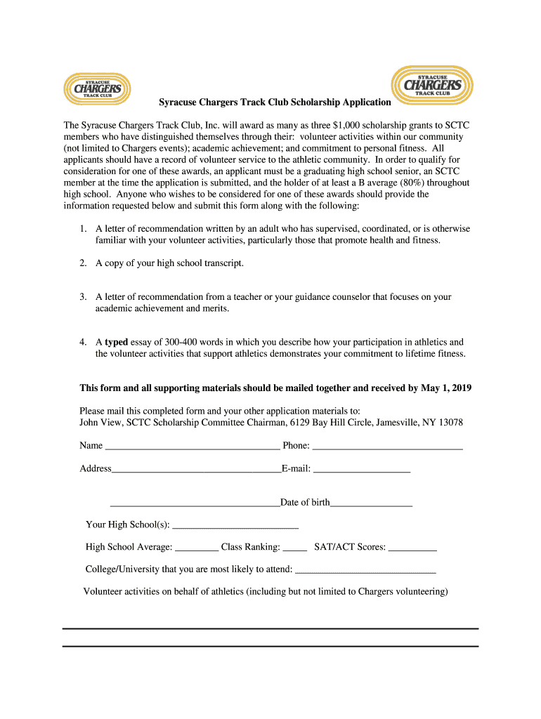 The Syracuse Chargers Track Club, Inc. will award as many as three $1,000 scholarship grants to CTC