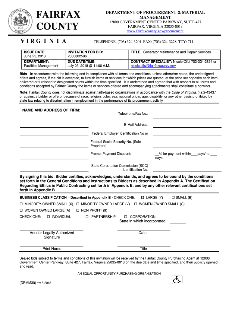 DEPARTMENT OF PROCUREMENT & MATERIAL MANAGEMENTFAIRFAX COUNTY VIRGO I N I A12000 GOVERNMENT CENTER PARKWAY, SUITE 427 FAIRFAX, VIRGINIA 220350013 www.fairfaxcounty.gov/procurement TELEPHONE: (703)