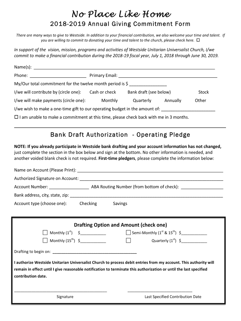 No Place Like Home 20182019 Annual Giving Commitment Form There are many ways to give to Westside. In addition to your financial contribution, we also welcome your time and talent. If you are willing