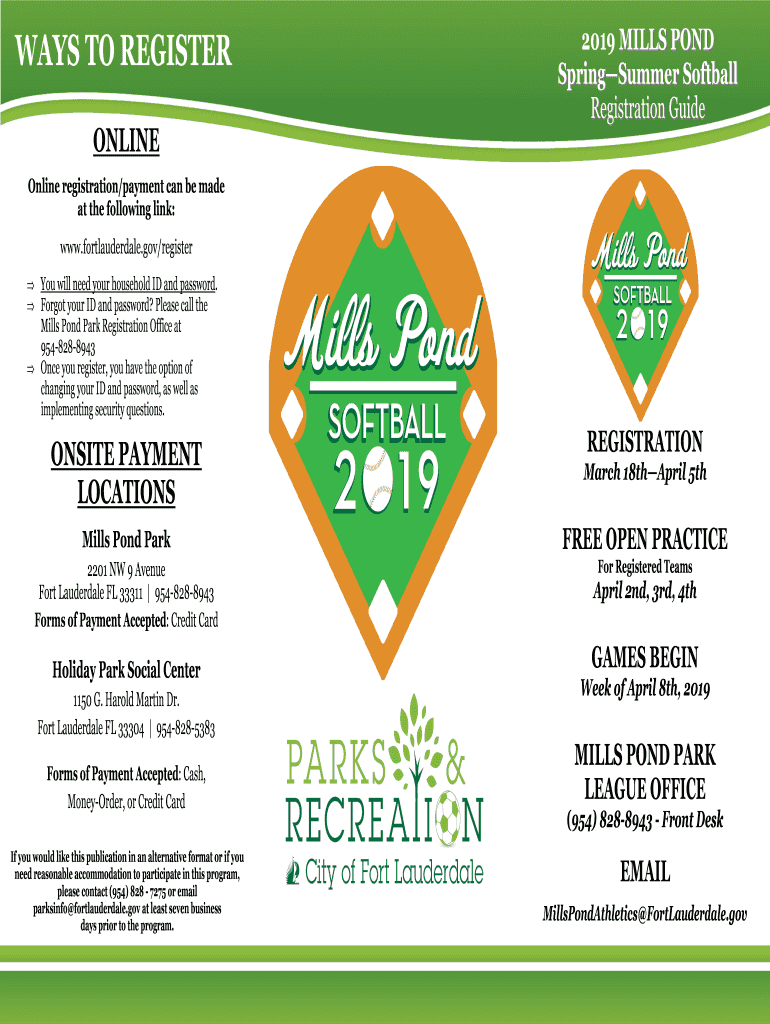 WAYS TO REGISTER2019 MILLS POND Spring Summer Softball Registration Guideline Online registration/payment can be made at the following link: www.fortlauderdale.gov/register You will need your household