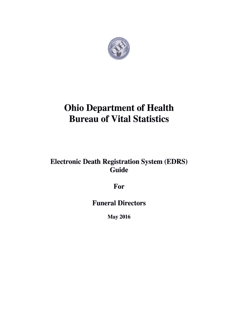 Ohio Department of Health Bureau of Vital StatisticsElectronic Death Registration System (EARS) Guide For Funeral Directors May 2016Ohio Department of Health Bureau of Vital Statistics Electronic