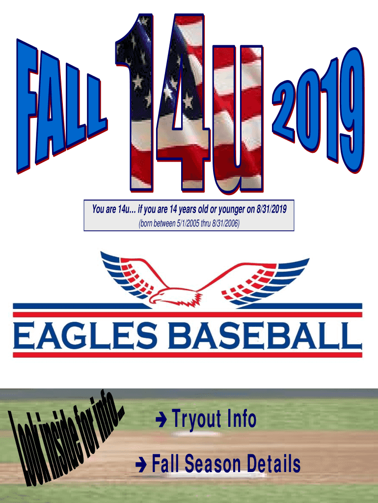 You are 14u if you are 14 years old or younger on 8/31/2019 (born between 5/1/2005 through 8/31/2006) Tryout Informal Season DetailsEagles Baseball Fall 2019 REGULAR SEASON LEAGUE PLAY & PLAYOFFS