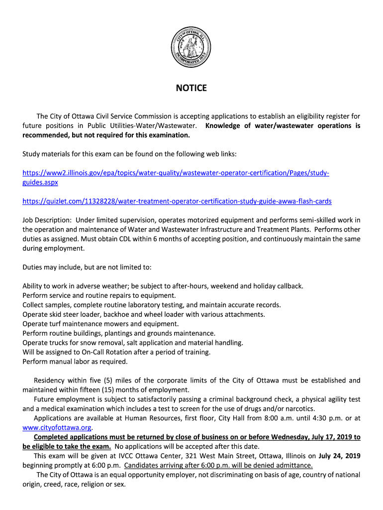 The City of Ottawa Civil Service Commission is accepting applications to establish an eligibility register for