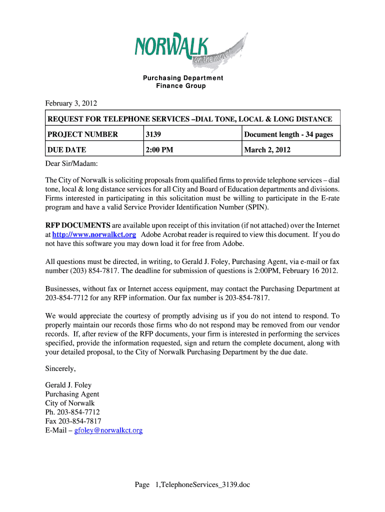 Purchasing Department Finance Group February 3, 2012, REQUEST FOR TELEPHONE SERVICES DIAL TONE, LOCAL & LONG DISTANCE PROJECT NUMBER3139Document length 34 pages DATE2:00 PM March 2, 2012Dear Sir/Madam: