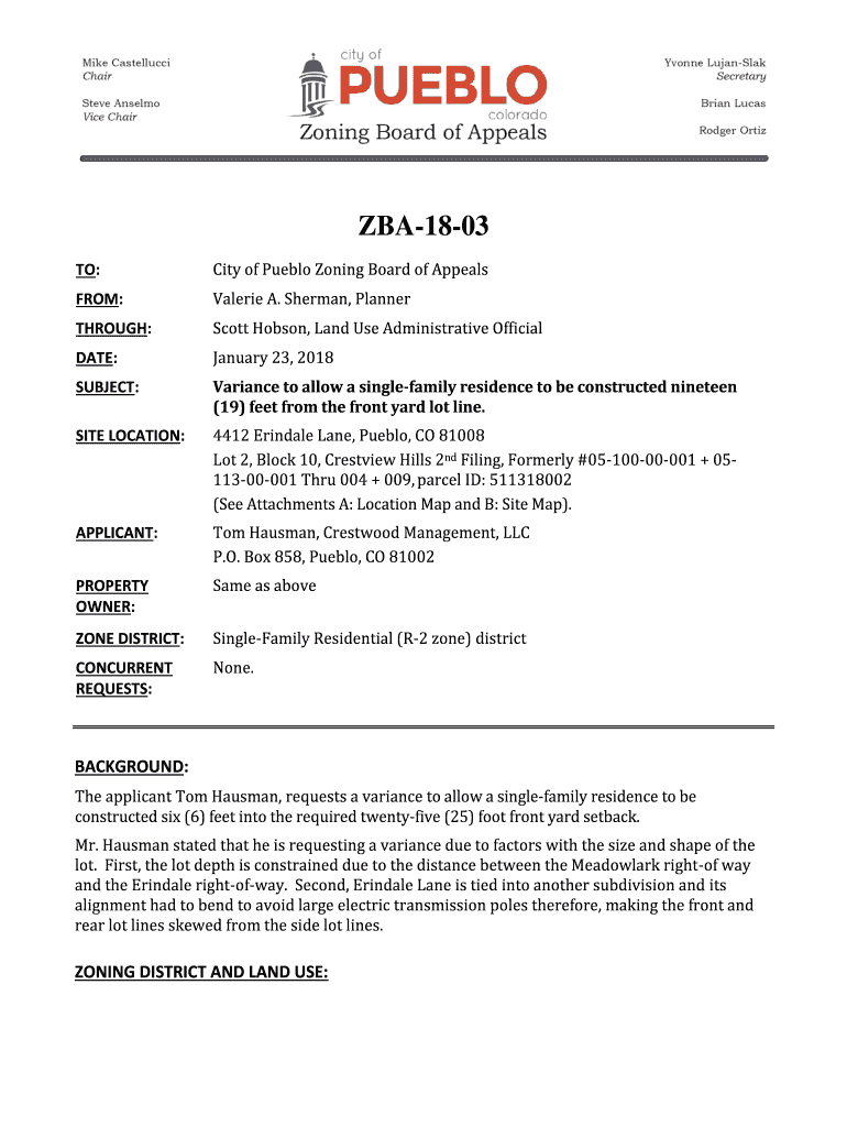 TO:City of Pueblo Zoning Board of AppealsFROM:Valerie A. Sherman, PlannerTHROUGH:Scott Hobson, Land Use Administrative Officiate:January 23, 2018SUBJECT:Variance to allow a single family residence