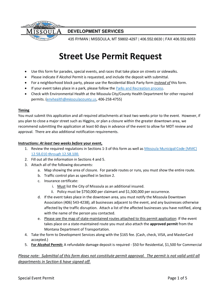 DEVELOPMENT SERVICES 435 ROMAN MISSOULA, MT 598024297 406.552.6630 FAX 406.552.6053Street Use Permit Request Use this form for parades, special events, and races that take place on streets or sidewalks.