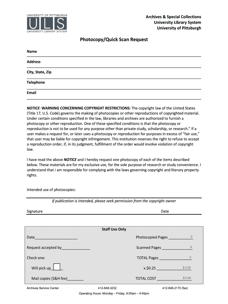 Archives & Special Collections University Library System University of PittsburghPhotocopy/Quick Scan Request Name Address City, State, Zip Telephone Email NOTICE: WARNING CONCERNING COPYRIGHT RESTRICTIONS: