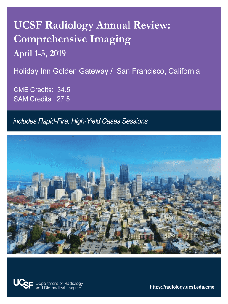 UCSF Radiology Annual Review: Comprehensive Imaging April 15, 2019, Holiday Inn Golden Gateway / San Francisco, California CME Credits: 34.5 SAM Credits: 27.5 includes Rapidity, High-yield Cases Sessionshttps://radiology.ucsf.edu/cmeUCSF