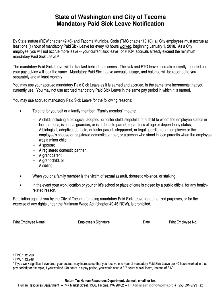 State of Washington and City of Tacoma Mandatory Paid Sick Leave Notification By State statute (RCW chapter 49.46) and Tacoma Municipal Code (TMC chapter 18.10), all City employees must accrue at