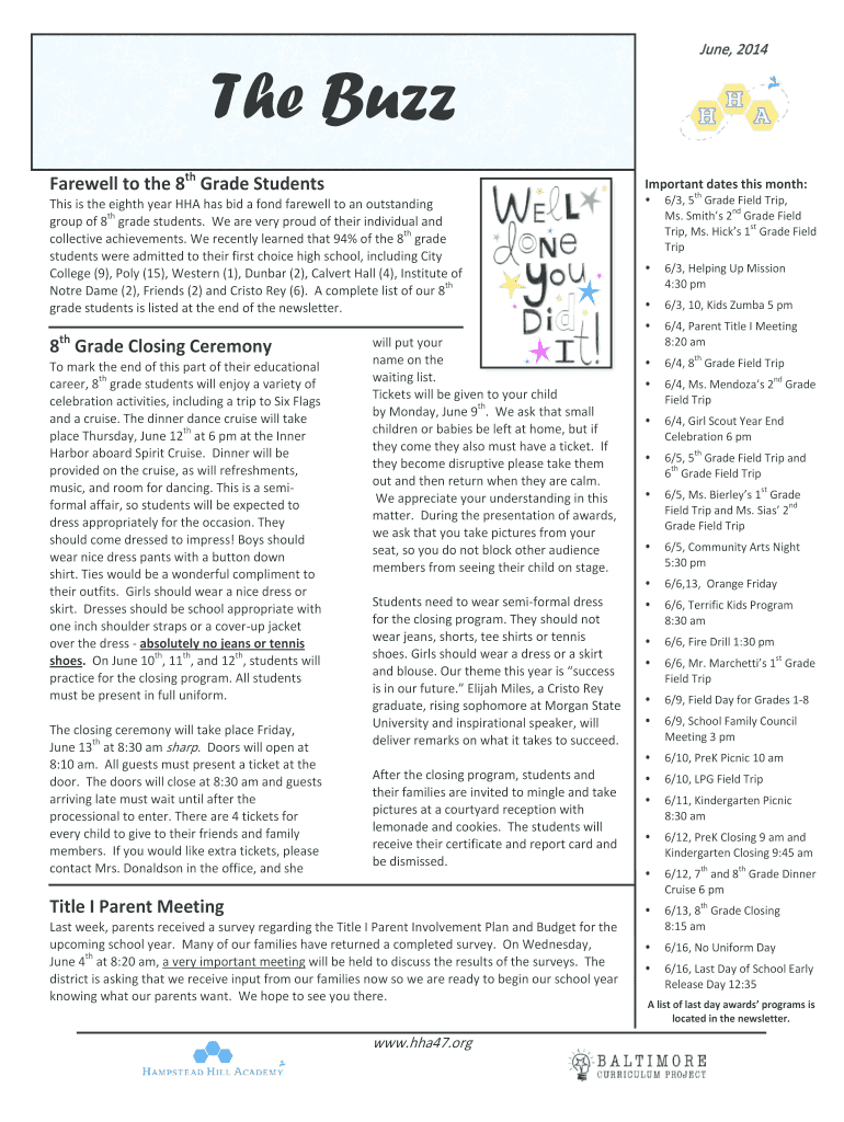 June 2014 The Buzz Farewell to the 8th Grade Students Important dates this month: TH 8 Grade Closing Ceremony To mark the end of this part of their educational TH career, 8 grade students will enjoy