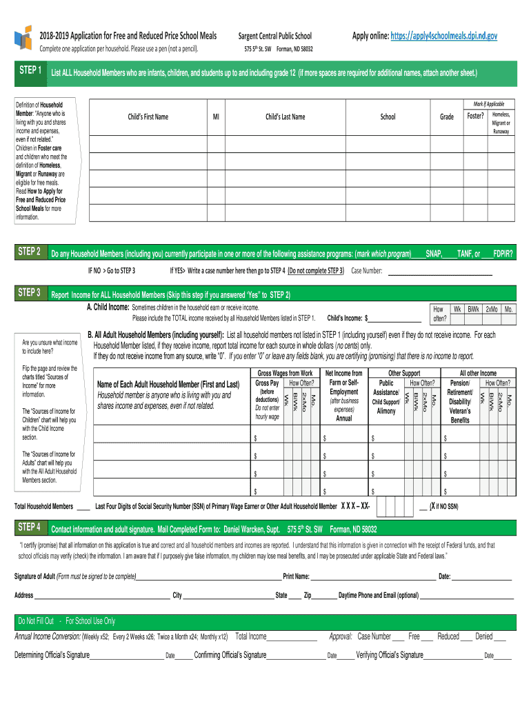 20182019 Application for Free and Reduced Price School Meals STEP 1Childs First NameForman, ND 58032MIChilds Last NameSchoolIf YES Write a case number here then go to STEP 4 (Do not complete STEP