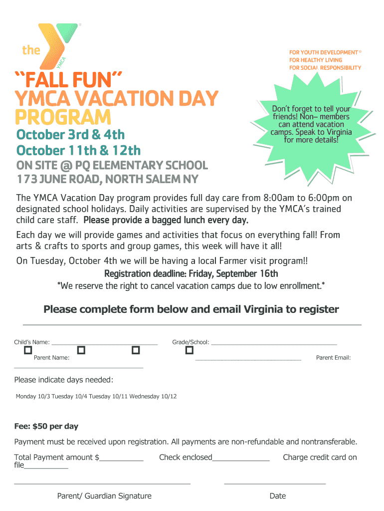 FALL FUN YMCA VACATION DAY Programming forget to tell your friends! Non-members can attend vacation camps. Speak to Virginia for more details! October 3rd & 4th October 11th & 12thON SITE PQ ELEMENTARY