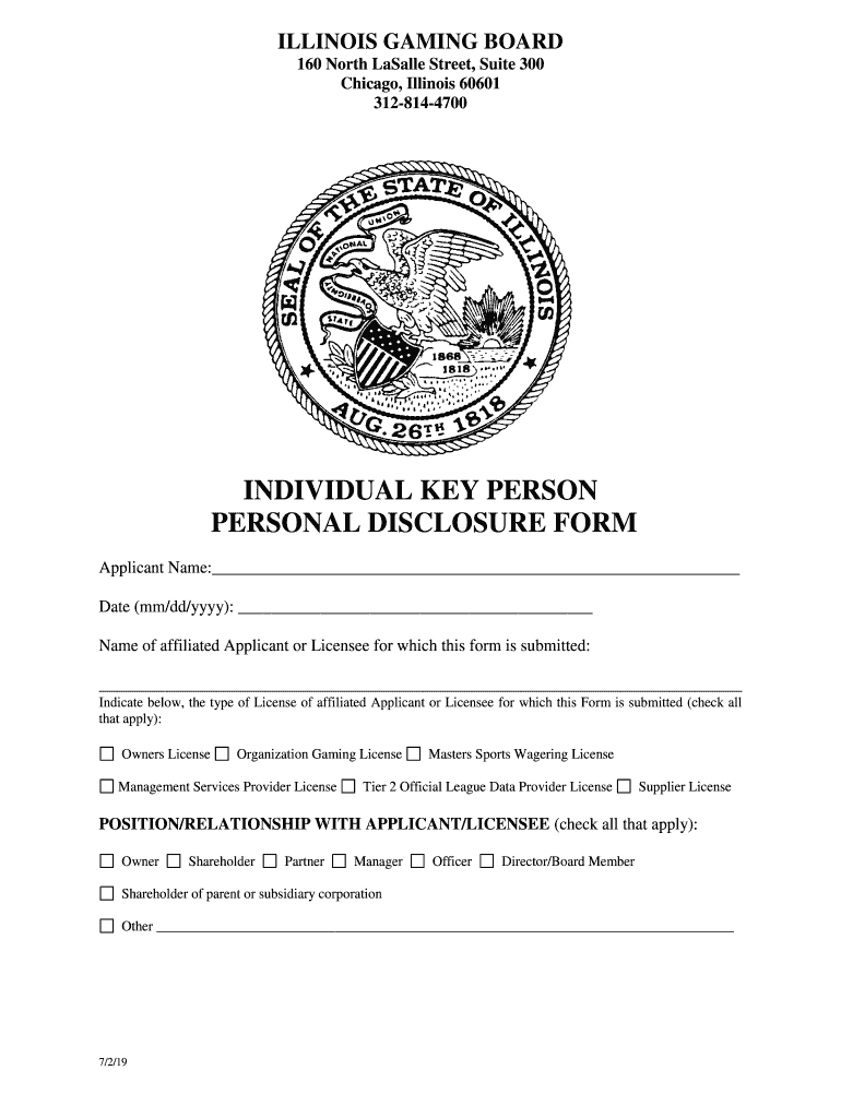 ILLINOIS GAMING BOARD 160 North Basally Street, Suite 300 Chicago, Illinois 60601 3128144700INDIVIDUAL KEY PERSON PERSONAL DISCLOSURE FORM Applicant Name: Date (mm/dd/YYY): Name of affiliated Applicant