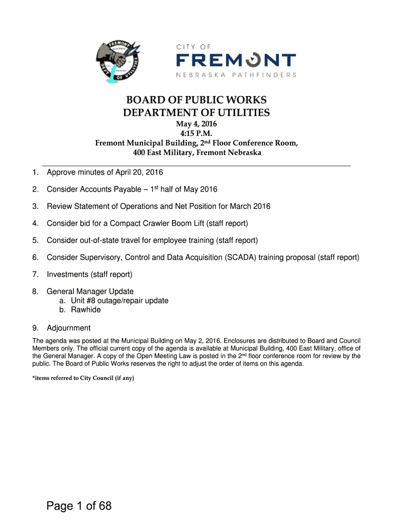 BOARD OF PUBLIC WORKS DEPARTMENT OF UTILITIES May 4, 2016 4:15 P.M. Fremont Municipal Building, 2nd Floor Conference Room, 400 East Military, Fremont Nebraska 1. Approve minutes of April 20, 20162.