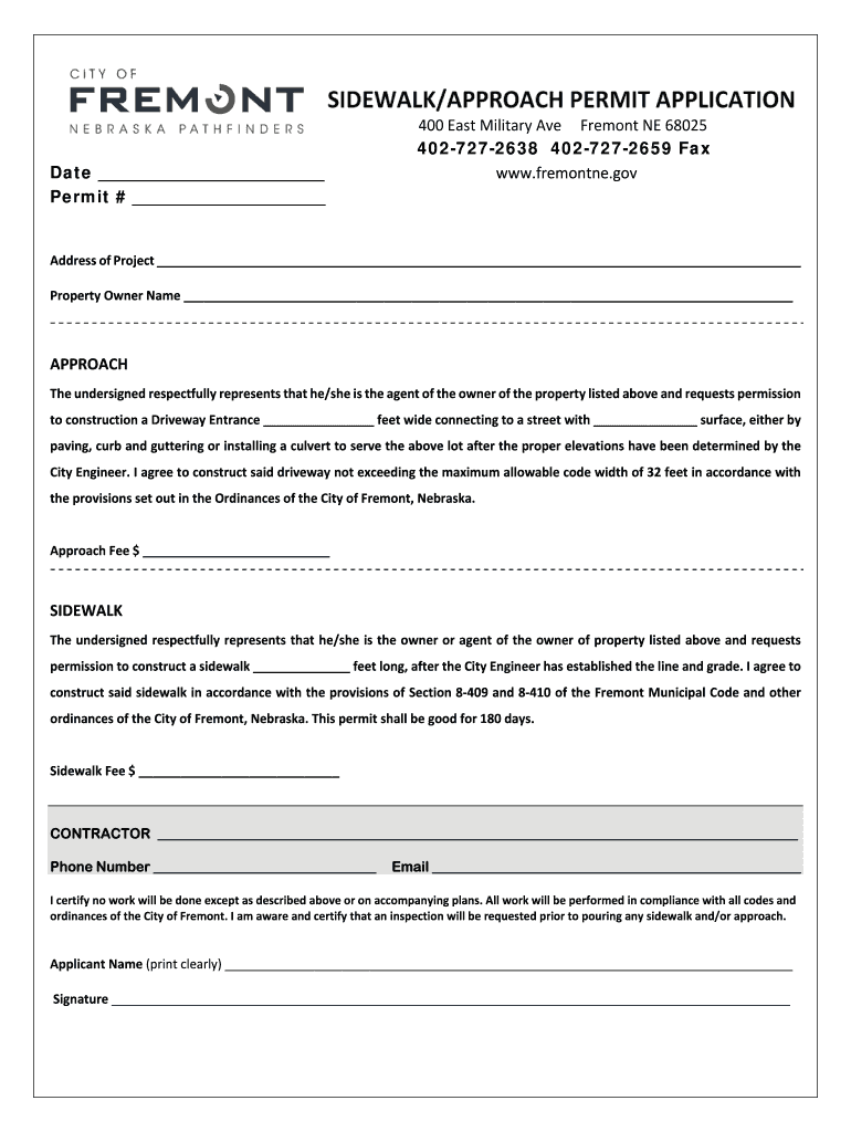 SIDEWALK/APPROACHPERMITAPPLICATION 400EastMilitaryAveFremontNE68025 Date Permit # 4027272638 4027272659 Fax www.fremontne.gov AddressofProject PropertyOwnerName APPROACH Theundersignedrespectfullyrepresentsthathe/sheistheagentoftheownerofthepropertylistedaboveandrequestspermission