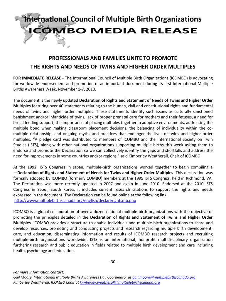 International Council of Multiple Birth Organizations COMBO MEDIA RELEASE PROFESSIONALS AND FAMILIES UNITE TO PROMOTE THE RIGHTS AND NEEDS OF TWINS AND HIGHER ORDER MULTIPLES FOR IMMEDIATE RELEASE