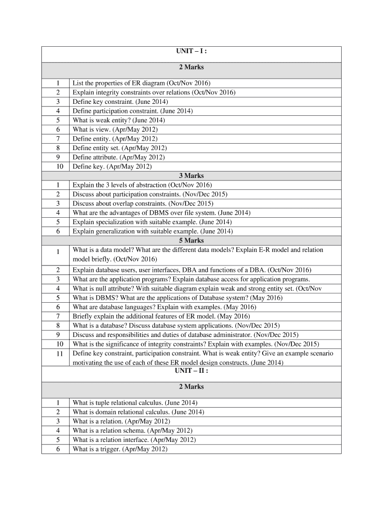 UNIT I : 2 Marks 1 2 3 4 5 6 7 8 9 10 1 2 3 4 5 6 1 2 3 4 5 6 7 8 9 10 11List the properties of ER diagram (Oct/Nov 2016) Explain integrity constraints over relations (Oct/Nov 2016) Define key constraint.