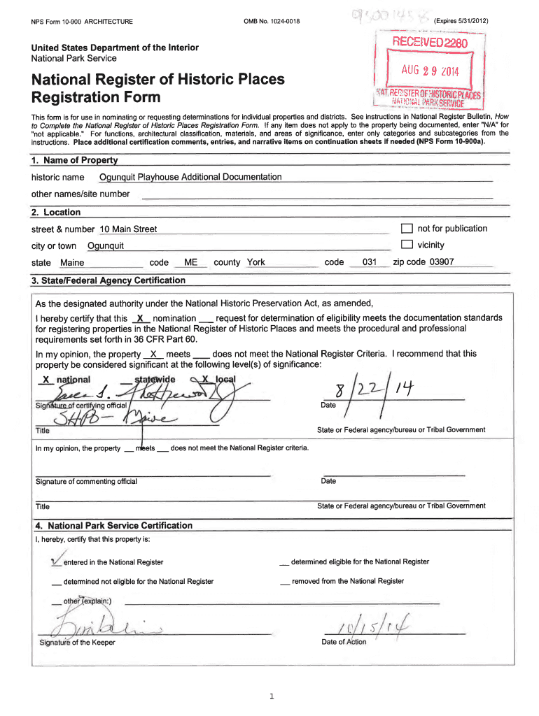 (Expires 5/31/2012)OMB No. 10240018NPS Form 10900 ARCHITECTUREUnited States Department of the Interior National Park ServiceINational Register of Historic Places Registration FormRECEIVED2280 AUG