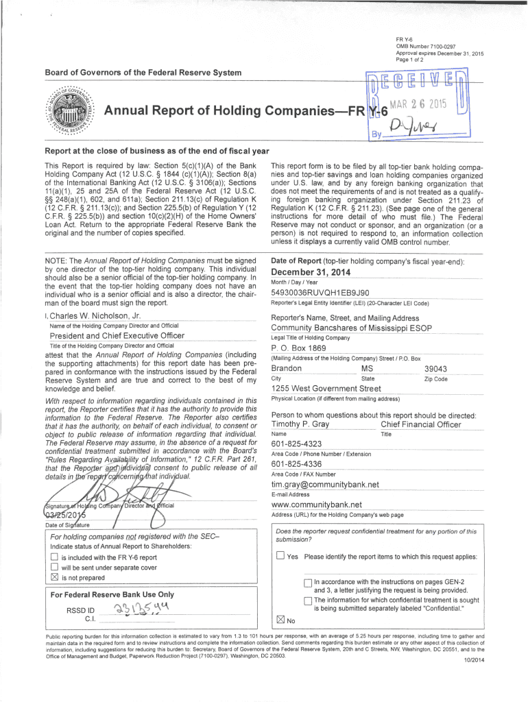 FR Y6 OMB Number 71000297 Approval expires December 31, 2015, Page 1of2Board of Governors of the Federal Reserve Systematical Report of Holding CompaniesFRGMAR 2 6 2015By o 'LFO/Report at the close