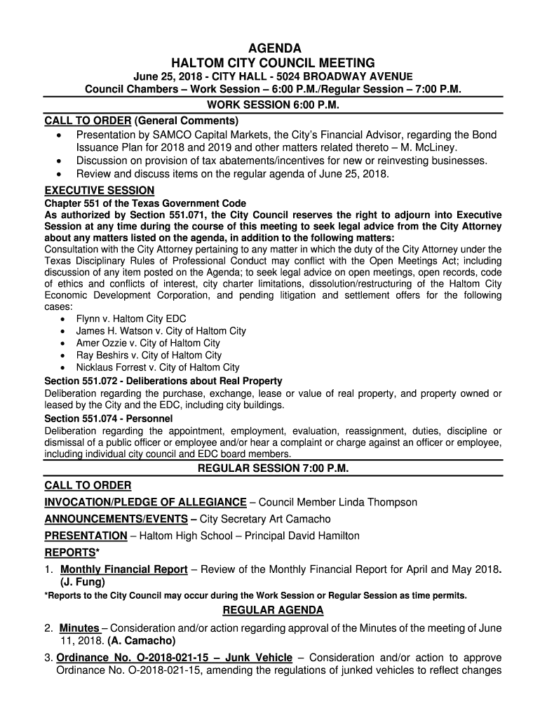 AGENDA HALT OM CITY COUNCIL MEETING June 25, 2018, CITY HALL 5024 BROADWAY AVENUE Council Chambers Work Session 6:00 P.M./Regular Session 7:00 P.M. WORK SESSION 6:00 P.M. CALL TO ORDER (General Comments)