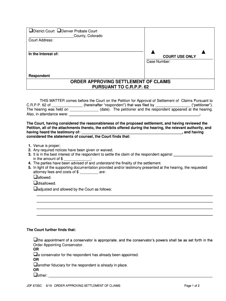 District Court Denver Probate Court County, Colorado Court Address:In the Interest of:COURT USE ONLY Case Number:RespondentORDER APPROVING SETTLEMENT OF CLAIMS PURSUANT TO C.R.P.P. 62 THIS MATTER