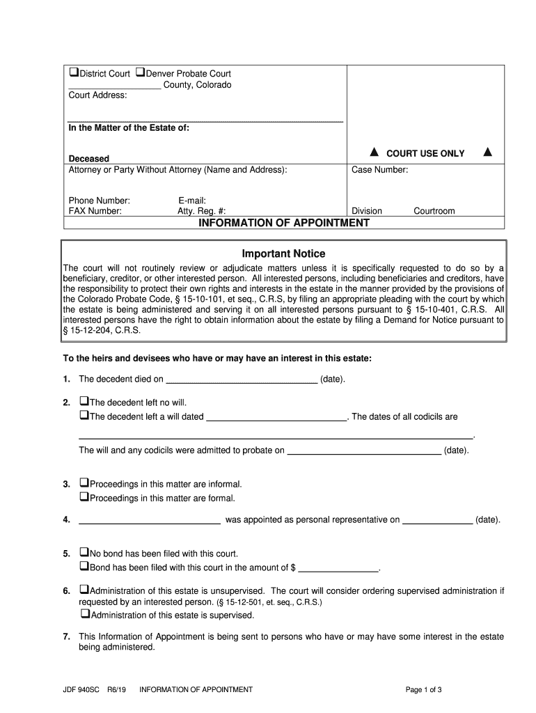 District Court Denver Probate Court County, Colorado Court Address:In the Matter of the Estate of: COURT USE ONLYDeceased Attorney or Party Without Attorney (Name and Address):Case Number:Phone Number: