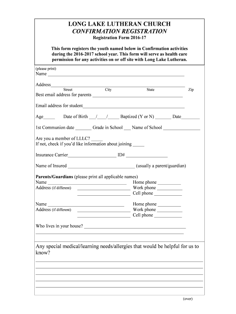 LONG LAKE LUTHERAN CHURCH CONFIRMATION REGISTRATION Form 201617 This form registers the youth named below in Confirmation activities during the 20162017 school year. This form will serve as health