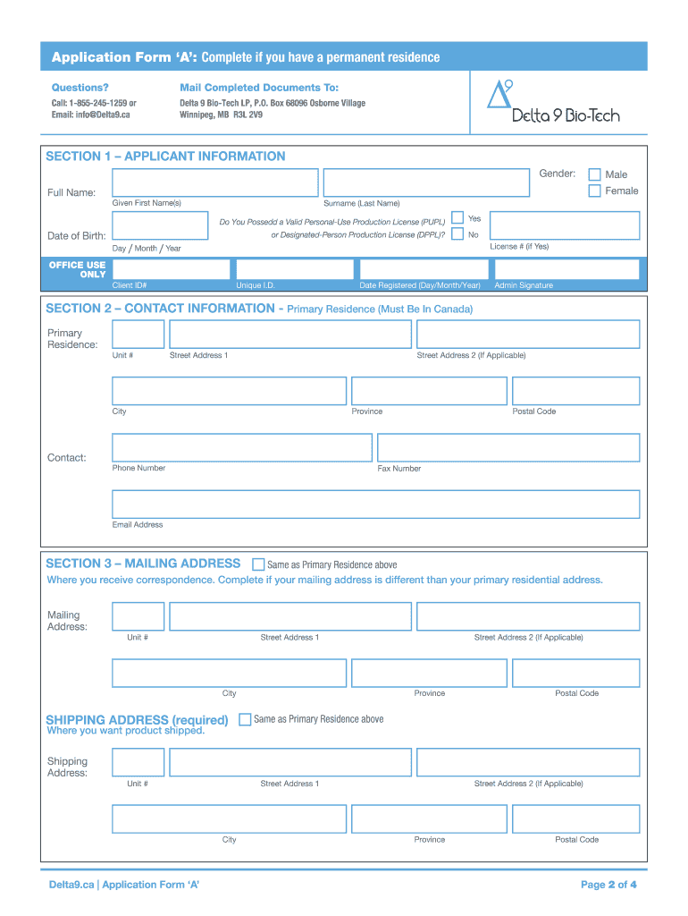The Delta 9 Medical Marijuana Application Form A is a healthcare document used by Canadian residents to register with Delta 9 Bio-Tech LP for receiving medicinal marijuana by mail.