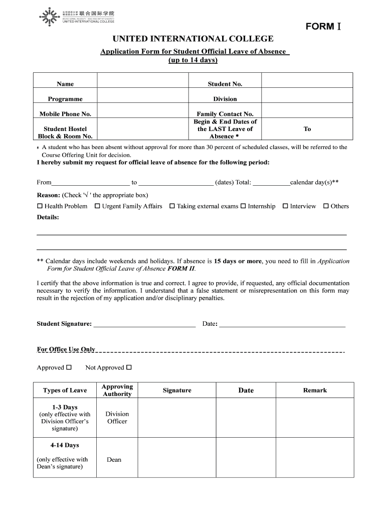 FORM UNITED INTERNATIONAL COLLEGE Application Form for Student Official Leave of Absence (up to 14 days) NameStudent No. ProgrammeDivisionMobile Phone No. Family Contact No. Begin & End Dates of the