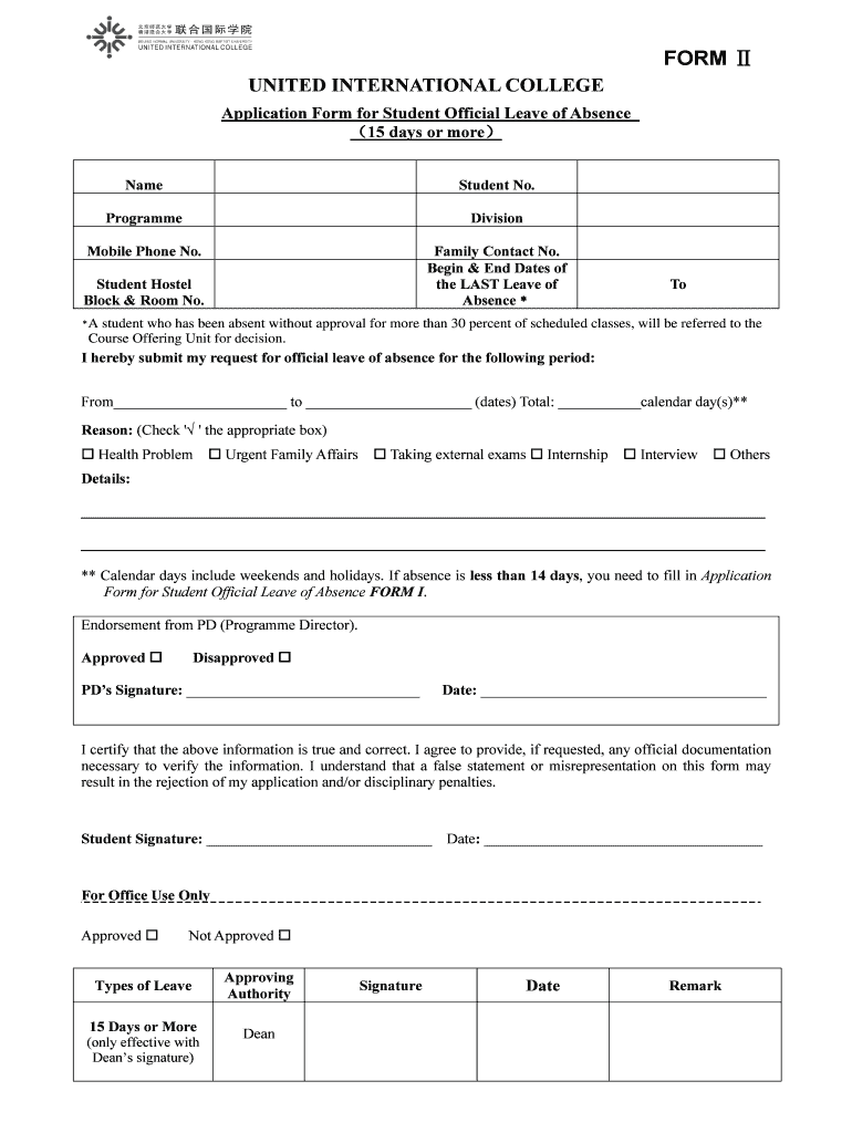 FORM UNITED INTERNATIONAL COLLEGE Application Form for Student Official Leave of Absence 15 days or more NameStudent No. ProgrammeDivisionMobile Phone No. Family Contact No. Begin & End Dates of the