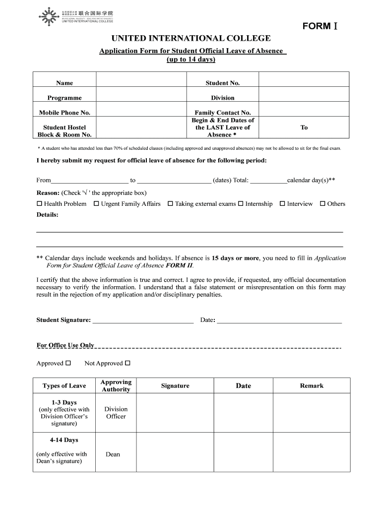 FORM UNITED INTERNATIONAL COLLEGE Application Form for Student Official Leave of Absence (up to 14 days) NameStudent No. ProgrammeDivisionMobile Phone No. Family Contact No. Begin & End Dates of the