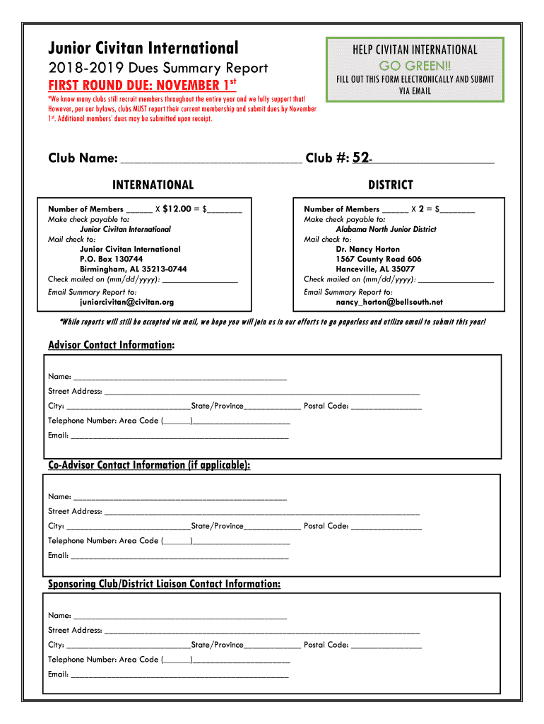 Junior Civilian International20182019 Dues Summary Report FIRST ROUND DUE: NOVEMBER 1stHELP CIVILIAN INTERNATIONAL GO GREEN!!*We know many clubs still recruit members throughout the entire year, and
