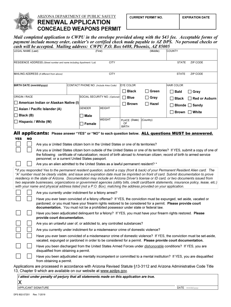 ARIZONA DEPARTMENT OF PUBLIC SAFETYRENEWAL APPLICATIONCURRENT PERMIT NO.EXPIRATION DATECONCEALED WEAPONS PERMIT