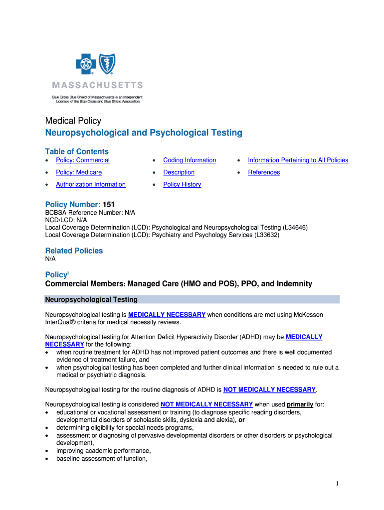 Get the free Neuropsychological and Psychological Testing - Blue Cross ...